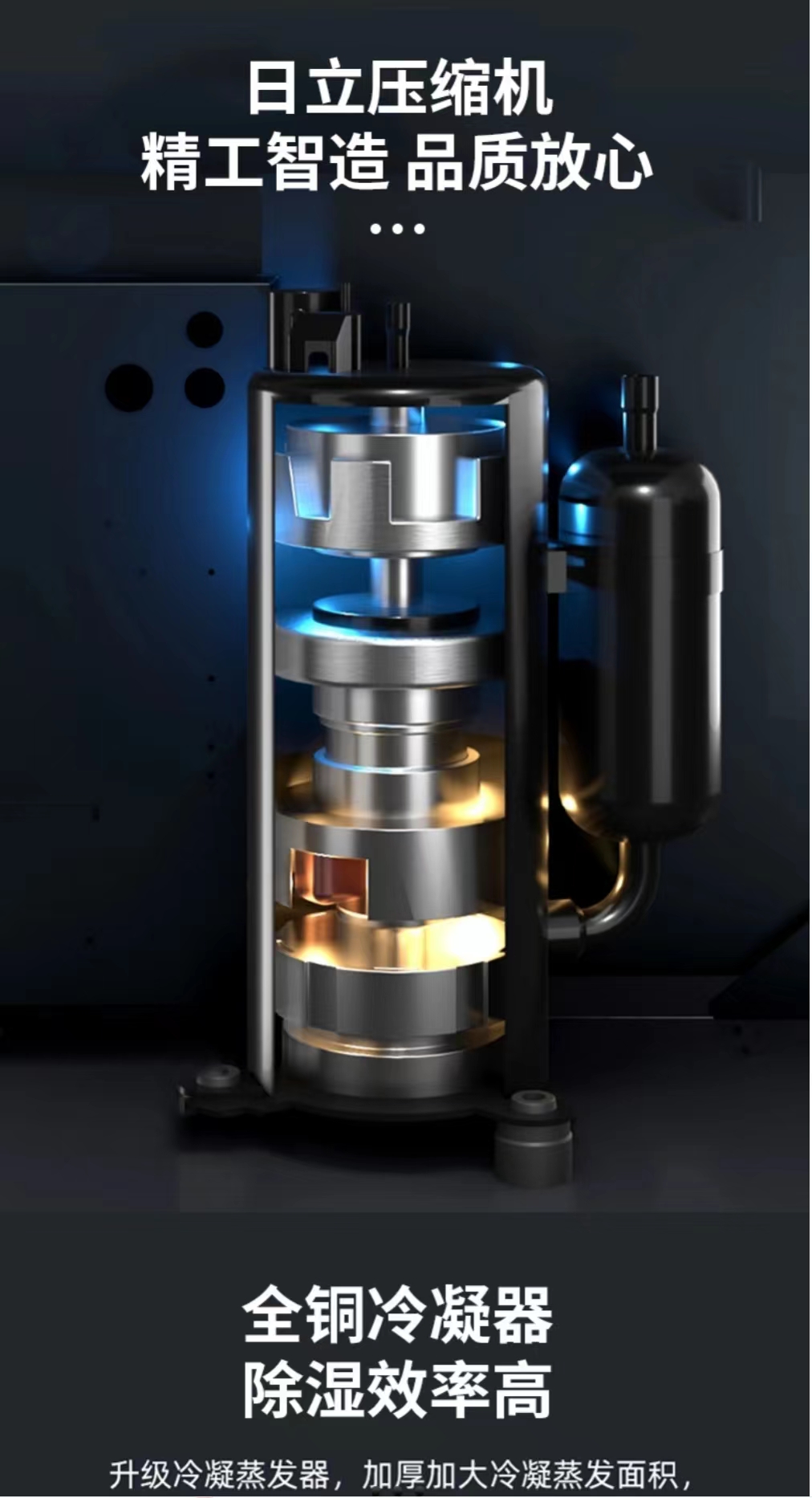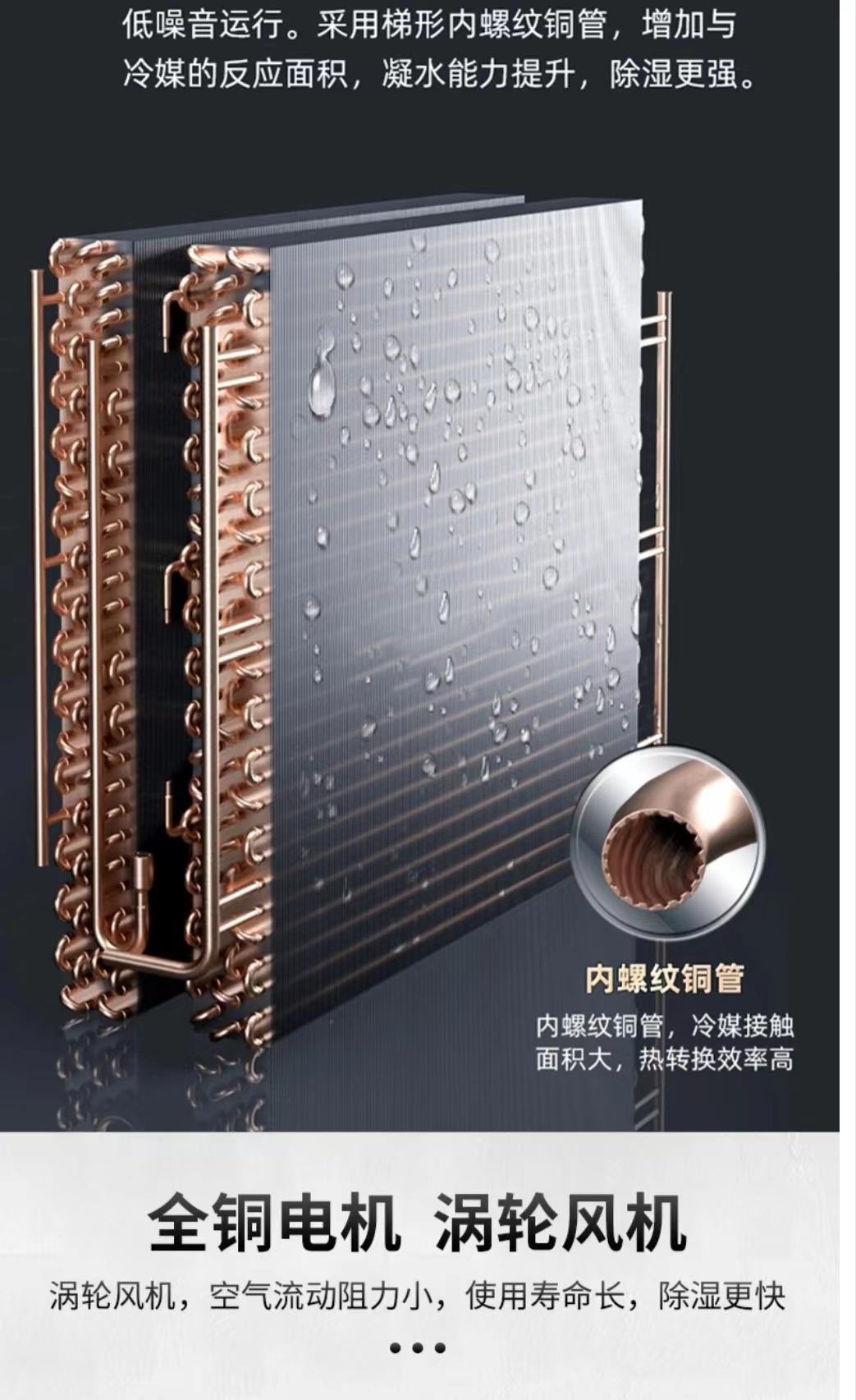 除濕機主要有壓縮機、熱交換器、風扇、盛水器、機殼及控制器等組成,其工作原理是:由風扇將潮濕空氣抽入機內,通過熱交換器,此時空氣中的水分子冷凝成水珠,處理過后的干燥空氣排出機外,如此循環(huán)使室內濕度保持在適宜的相對濕度。