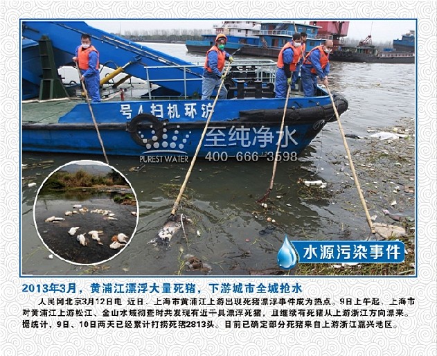 第一幅:2013年3月,黃浦江漂浮大量死豬,下游城市全城搶水