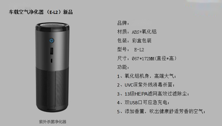 - 產(chǎn)品簡介:紫外線殺菌車載凈化器,UVC紫外線高效殺菌。鋁合金材質(zhì)隨車啟動,高效HEPA濾網(wǎng)和負(fù)離子快速清除Pm2.5、煙霧、灰塵。13級高效HEPA濾網(wǎng)。不帶電池。