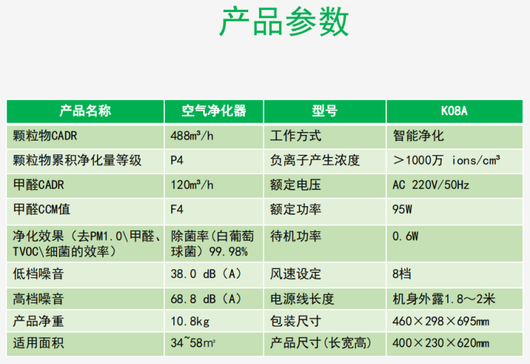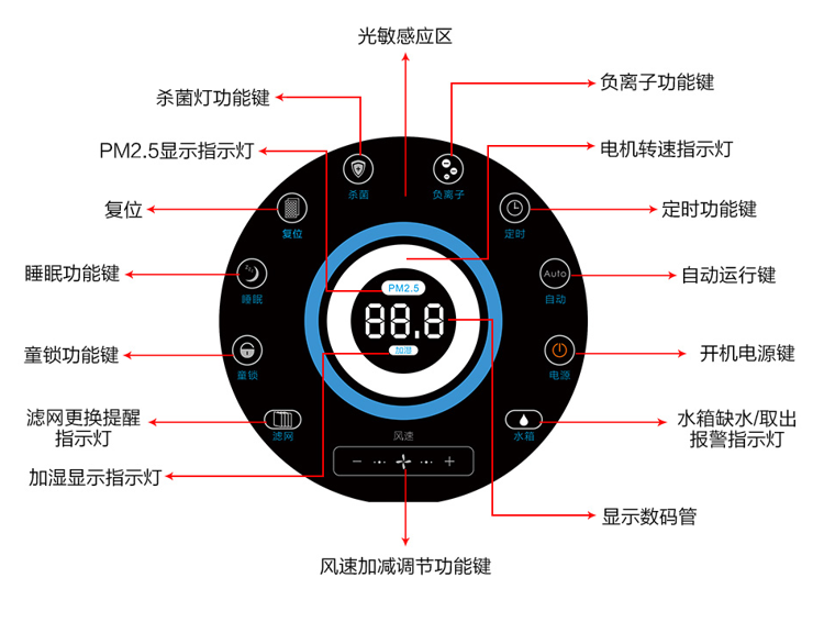 - 產(chǎn)品簡介:紫外線殺菌+加濕+除甲醛+負離子+活性炭+HEPA濾網(wǎng),全能型空氣凈化器